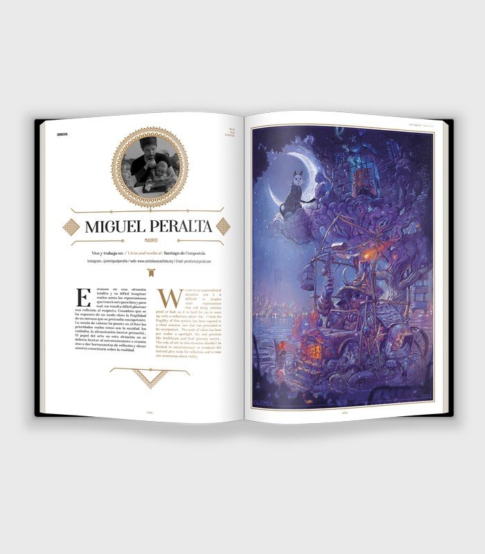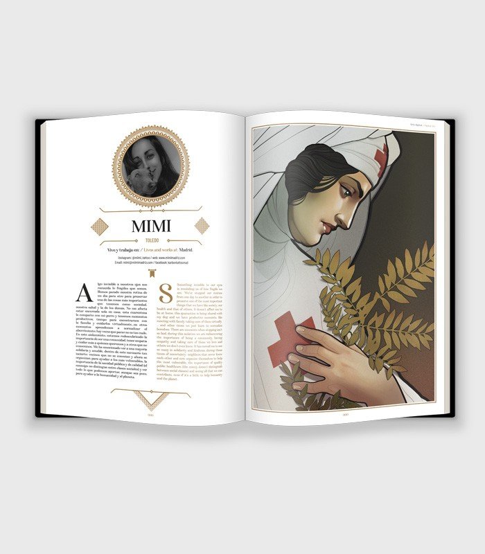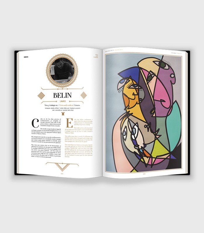 Hemos realizado un memorable libro-joya de más de 300 páginas como excepcional recordatorio de las inusuales circunstancias. Con unas cubiertas de tapa dura forradas en tela negra y estampadas en oro con seriegrafía blanca. Un papel estucado mate para que luzca al máximo el trabajo de cada artista, y coseremos una cinta de tela a modo de marcapáginas.